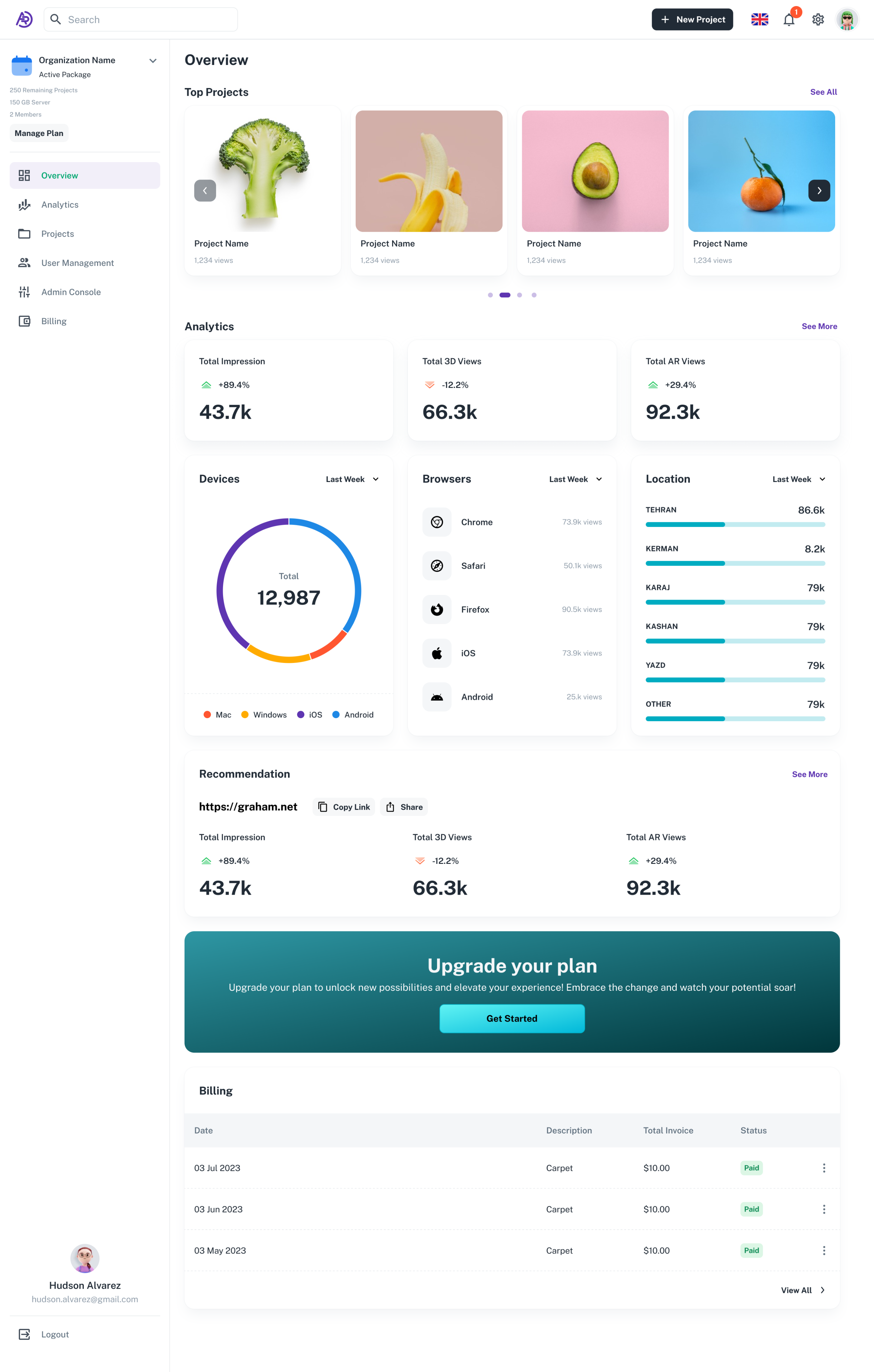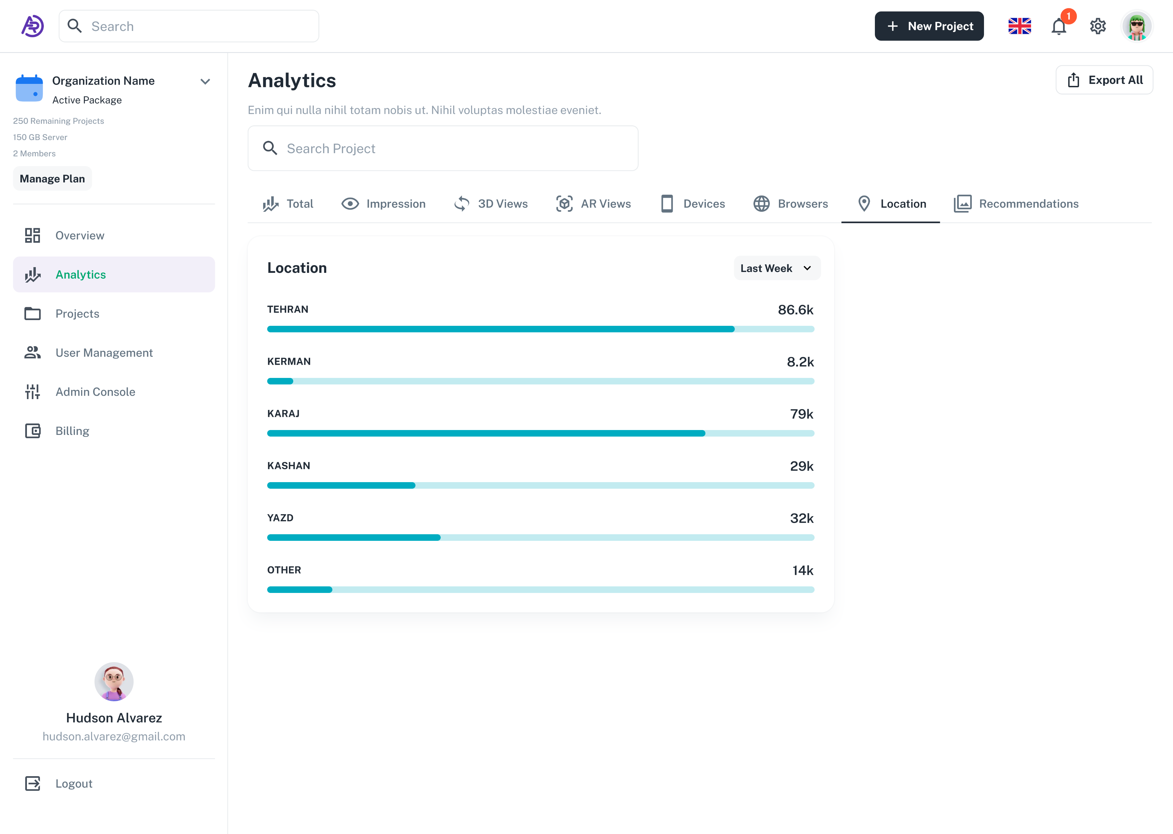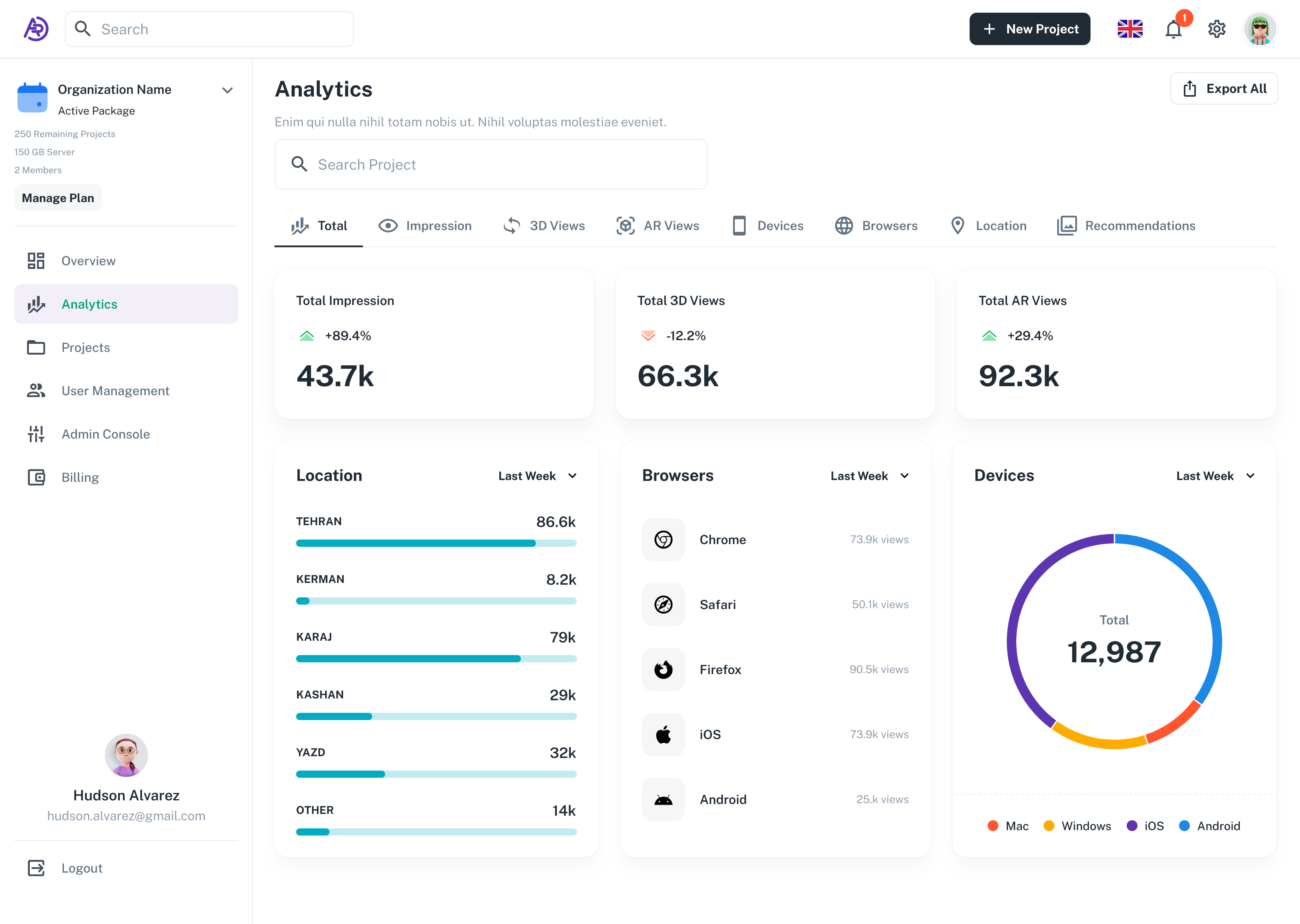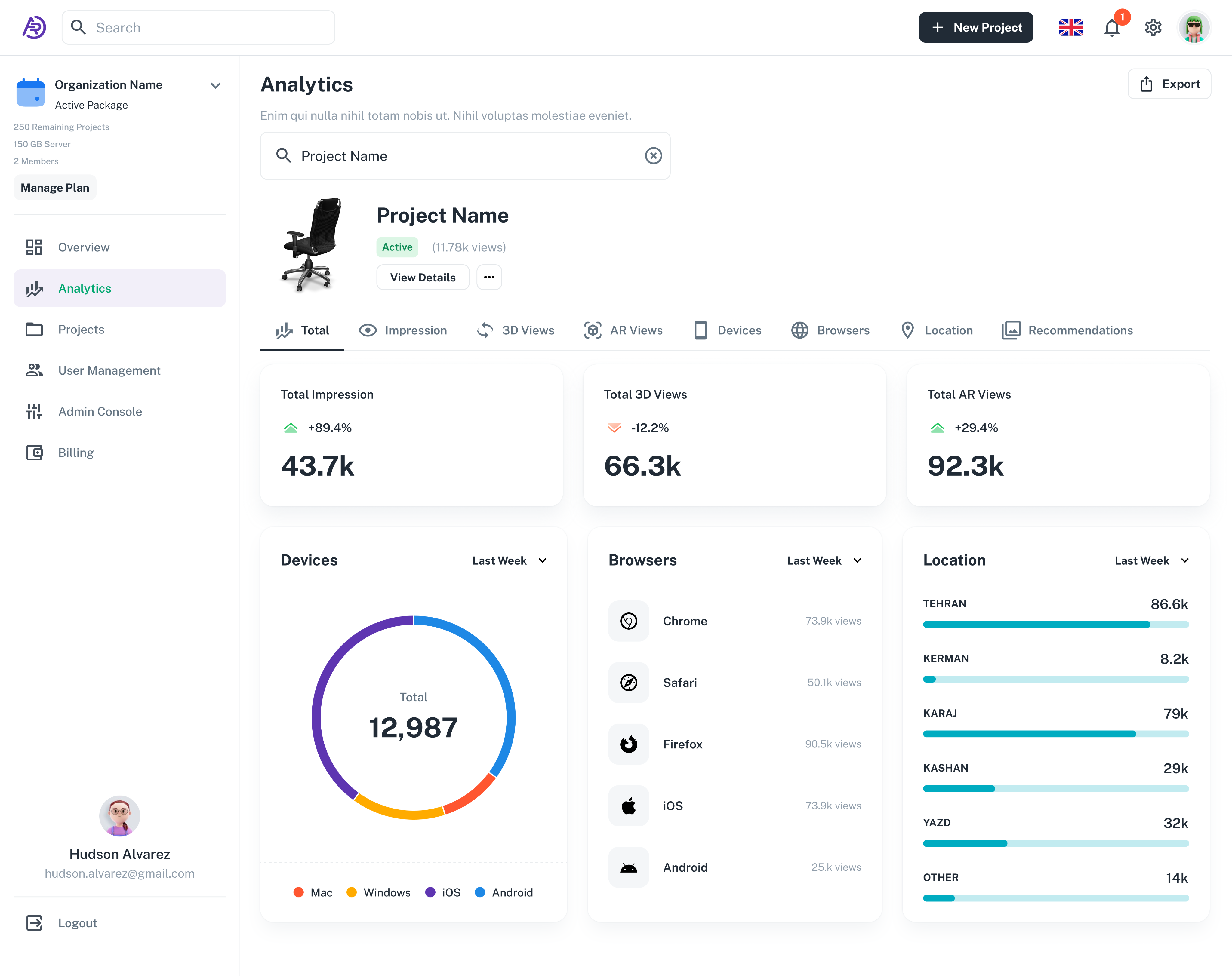 Users can search for individual projects to view detailed performance breakdowns. This page combines key metrics — impressions, 3D views, AR usage, devices, browsers, and location — in one unified layout. The challenge here was to visualize multiple dimensions of data while keeping the interface lightweight and user-friendly.
