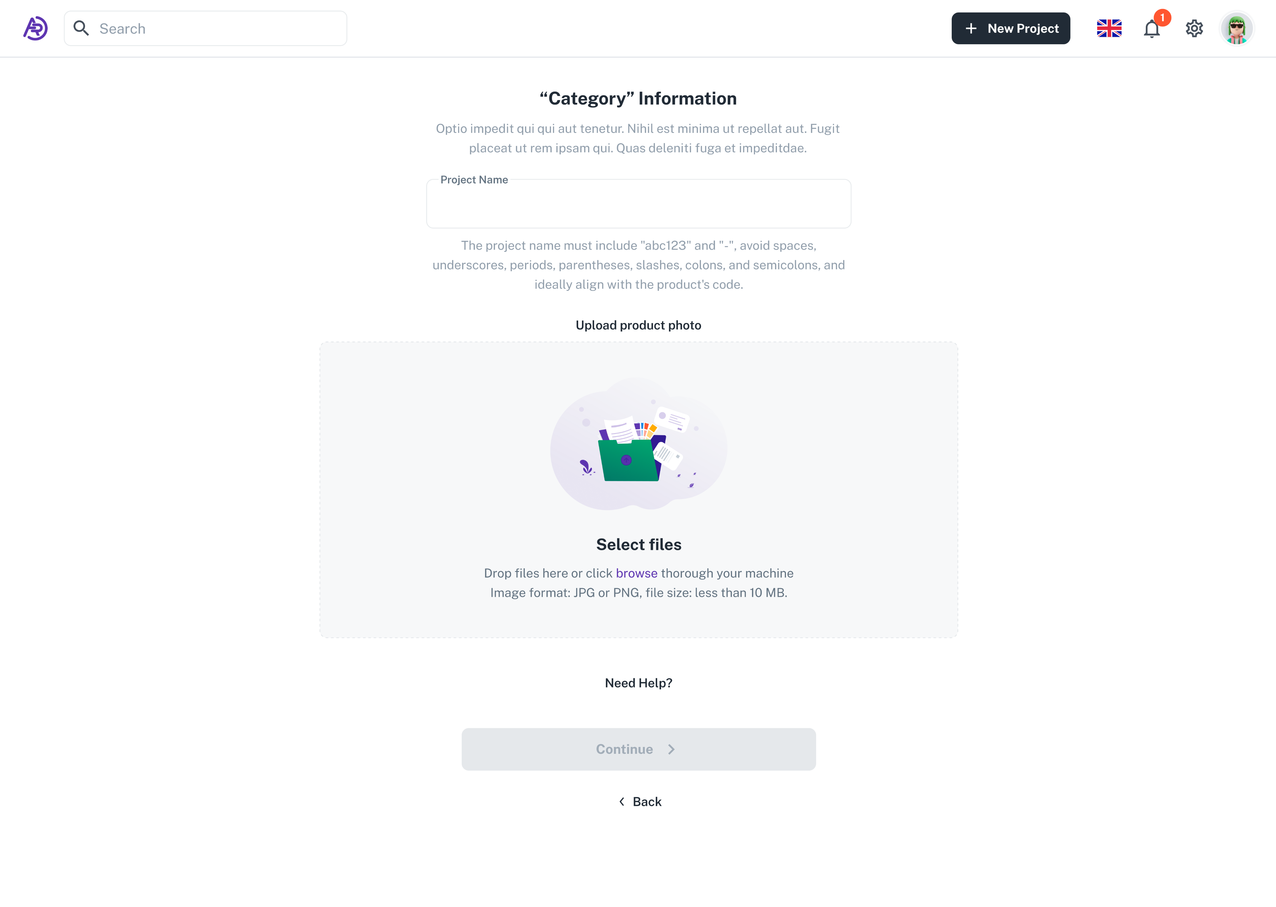 The first step of project creation helps users categorize their products easily. By using clear icons and a minimal layout, the page ensures that even first-time users can intuitively select the right product type (e.g., ring, necklace, accessories). The goal was to reduce cognitive load and make the onboarding process smooth and visually consistent.