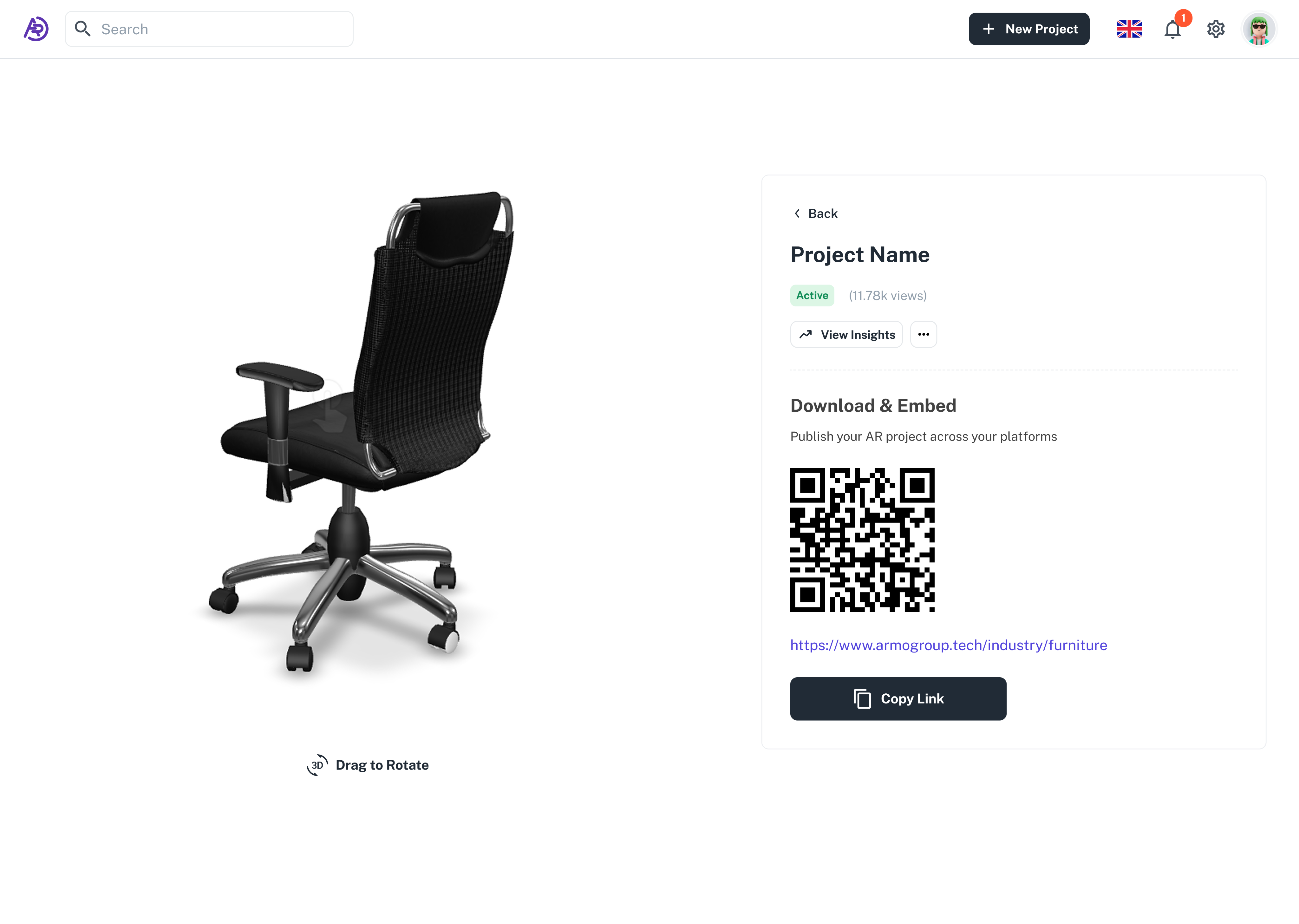 This screen is where users can preview and share their final 3D or AR project. It combines an interactive model viewer on the left with project metadata and publishing options on the right. Users can rotate the model in real time, view performance insights, and generate QR codes or shareable links to embed the experience on external platforms. The design maintains a minimalist structure that prioritizes focus on the 3D object, enhancing immersion and usability.