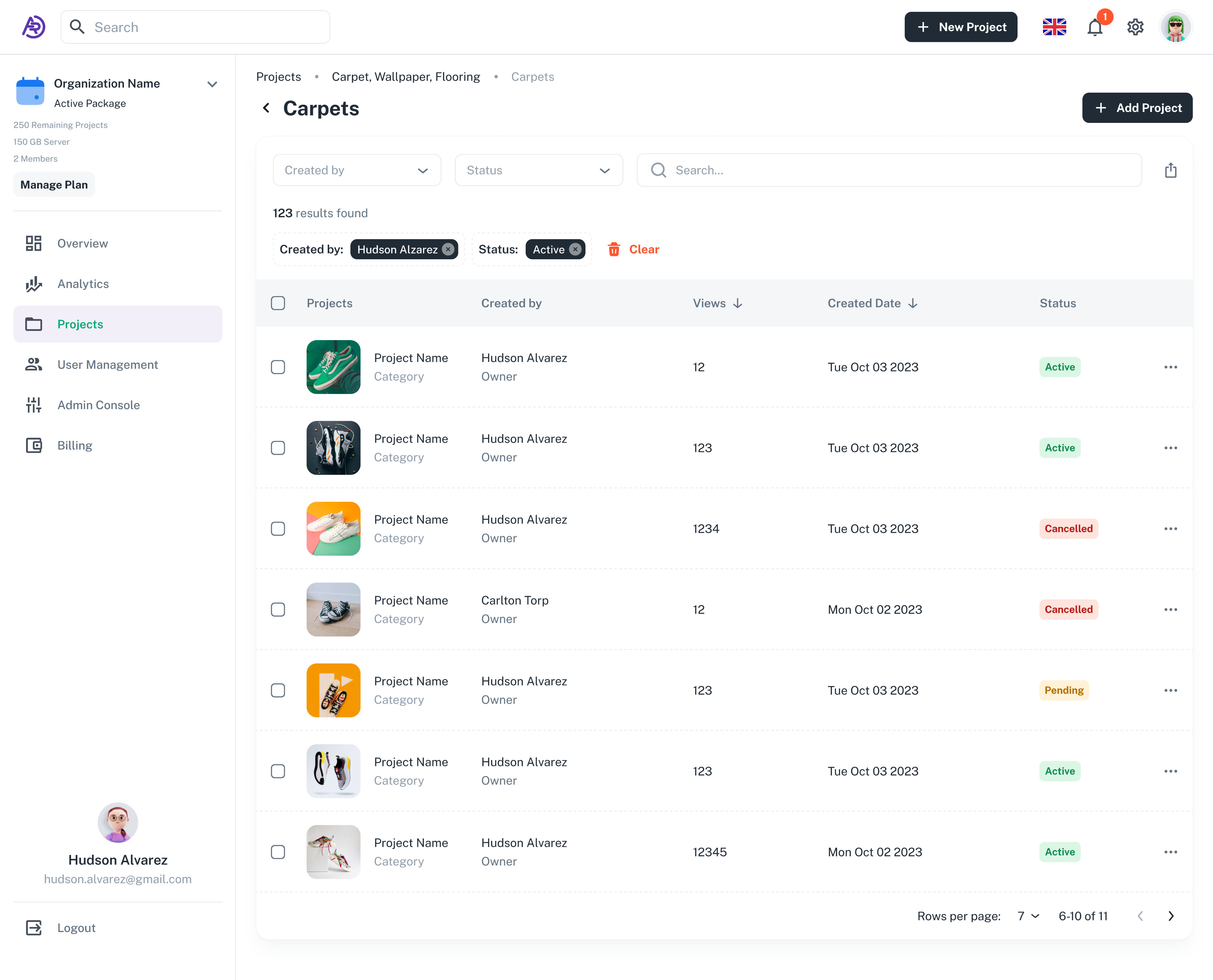 Here, users can browse and manage all projects within a specific category. The table layout provides powerful filtering and sorting capabilities by creator, date, and status. Status indicators (Active, Pending, Cancelled) use color-coded tags to improve scanability, while thumbnails make it easy to visually identify each 3D project. This page was designed to balance functionality and cleanliness — keeping it data-heavy yet visually calm.