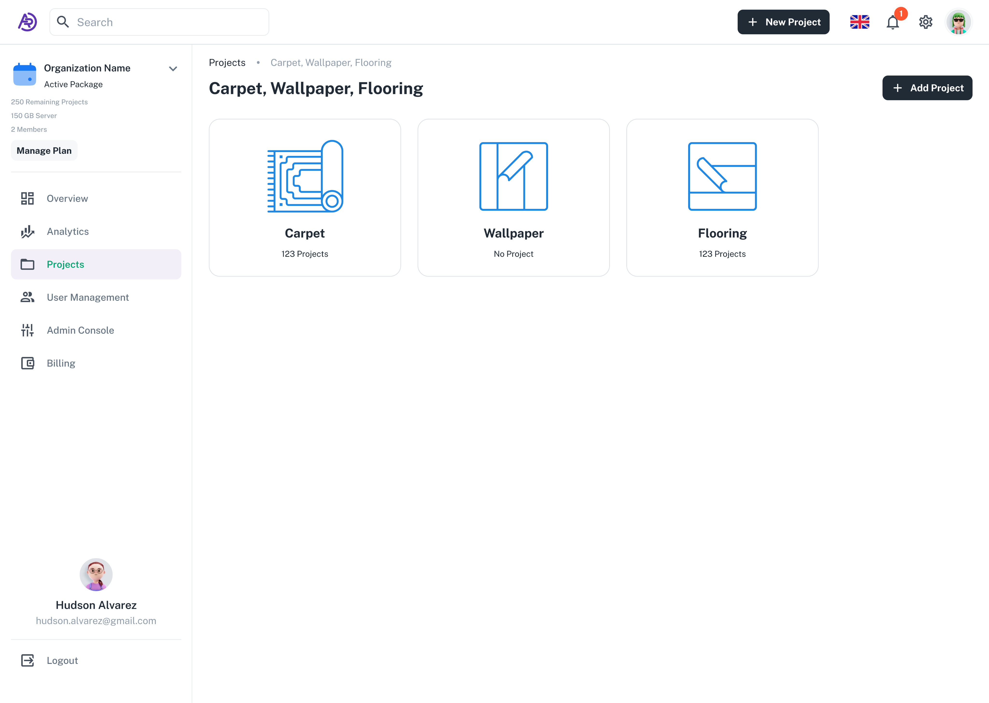 This section presents all product categories within an organization, such as carpets, wallpapers, and flooring. The goal was to give users a clear structural overview of their projects through recognizable icons and consistent layouts. The interface emphasizes simplicity and clarity, helping users quickly locate and manage their AR assets with minimal navigation effort.
