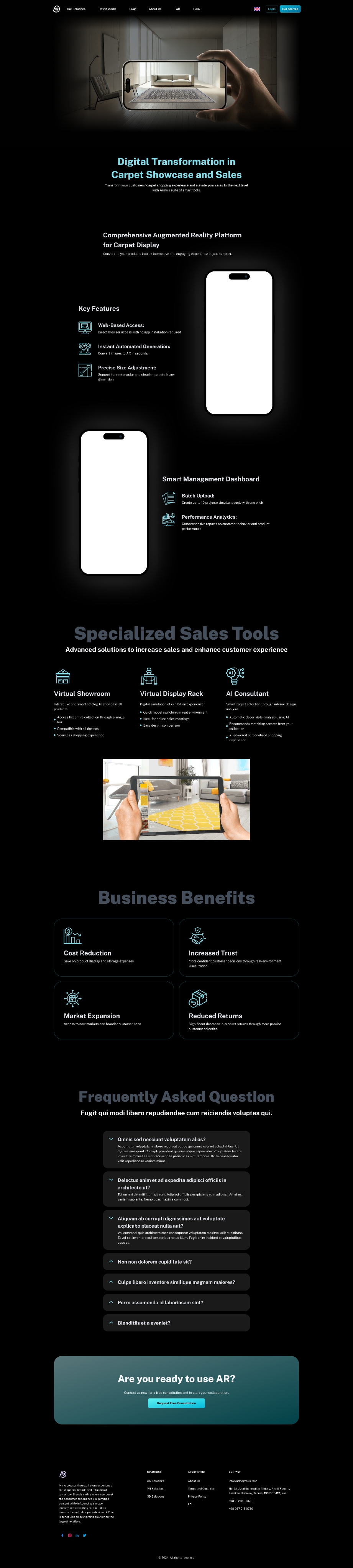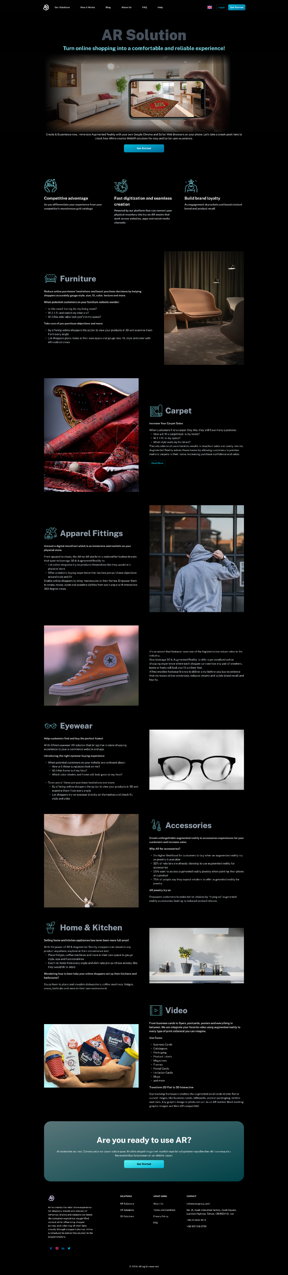 The hero section highlights the core concept — bridging digital and physical worlds through augmented reality — with an interactive visual that immediately communicates the product’s purpose. Below, the “Try Now” and “Why AR?” sections guide visitors to understand how the platform works and the benefits of adopting AR in e-commerce.