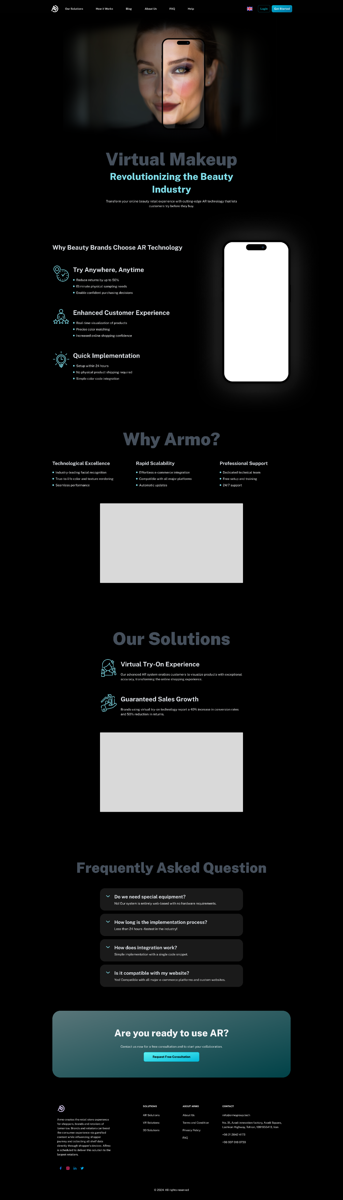 The homepage was designed to introduce ARmo’s value proposition in a clear and visually immersive way.