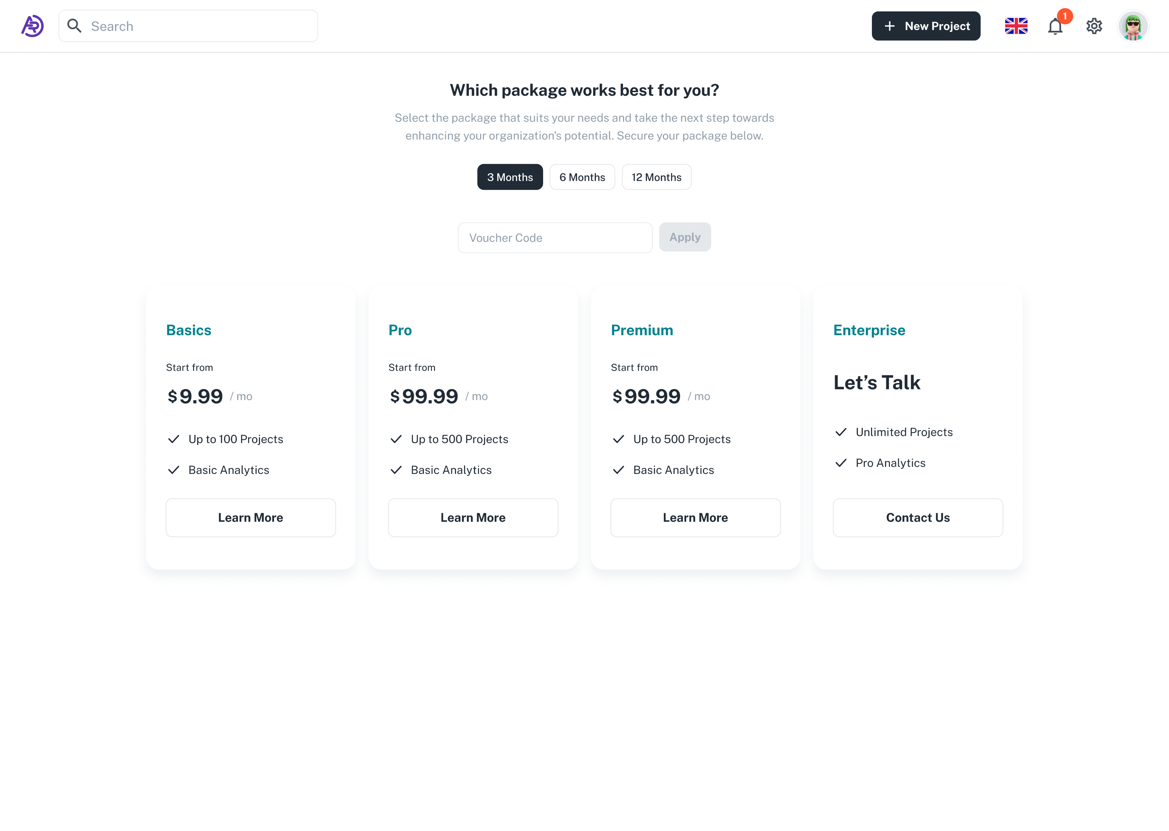 The subscription screen allows users to select the most suitable plan for their business needs. Pricing cards are visually consistent, with clear contrast and legible typography, making comparison easy. The design emphasizes transparency and trust by presenting all options upfront with simple call-to-actions.
