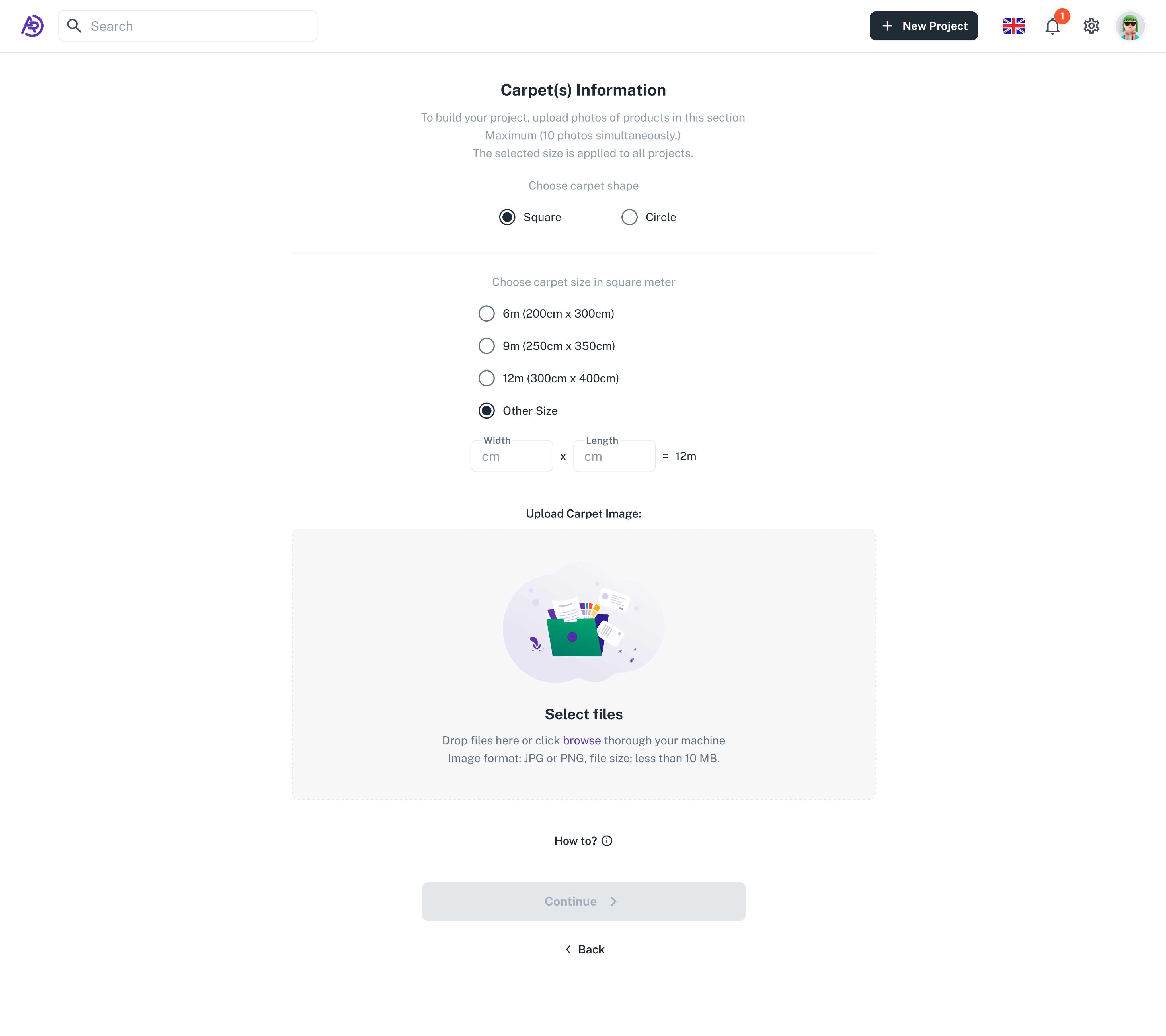 This screen is part of the product setup flow for carpet retailers. It allows users to define the carpet’s shape, size, and dimensions before uploading their product images. The interface follows a step-by-step approach, minimizing user error and providing quick visual feedback for each selection.