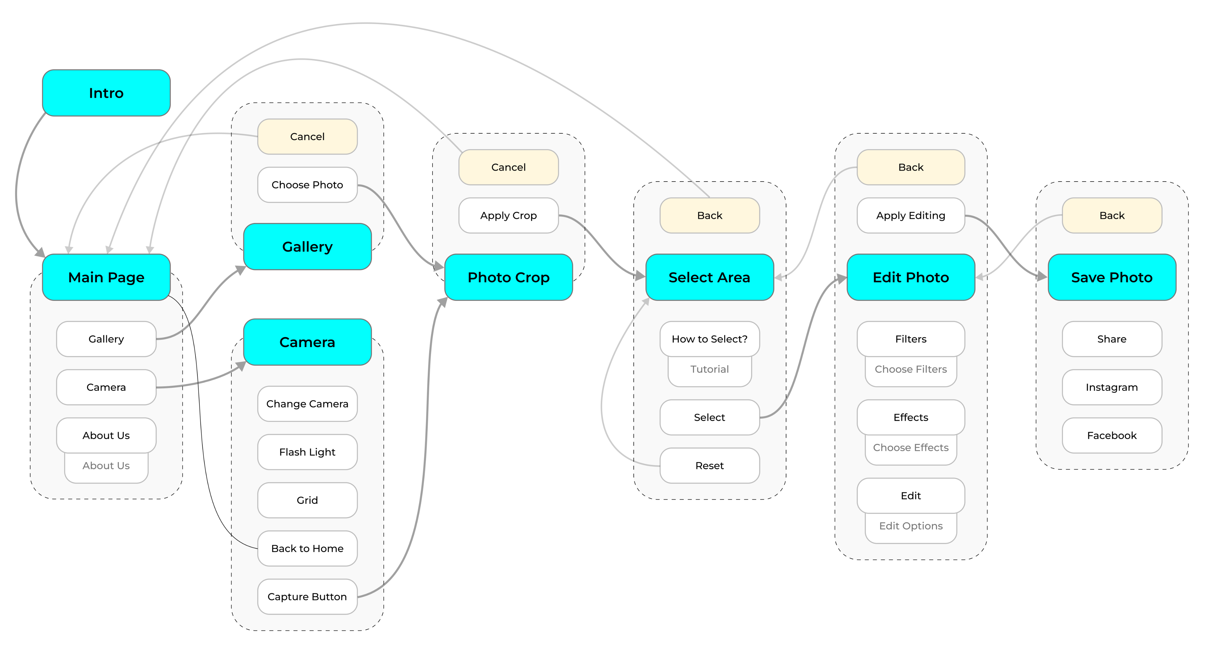 A clear user flow diagram was created to map the main tasks, from launching the app to completing a photo edit. This included: